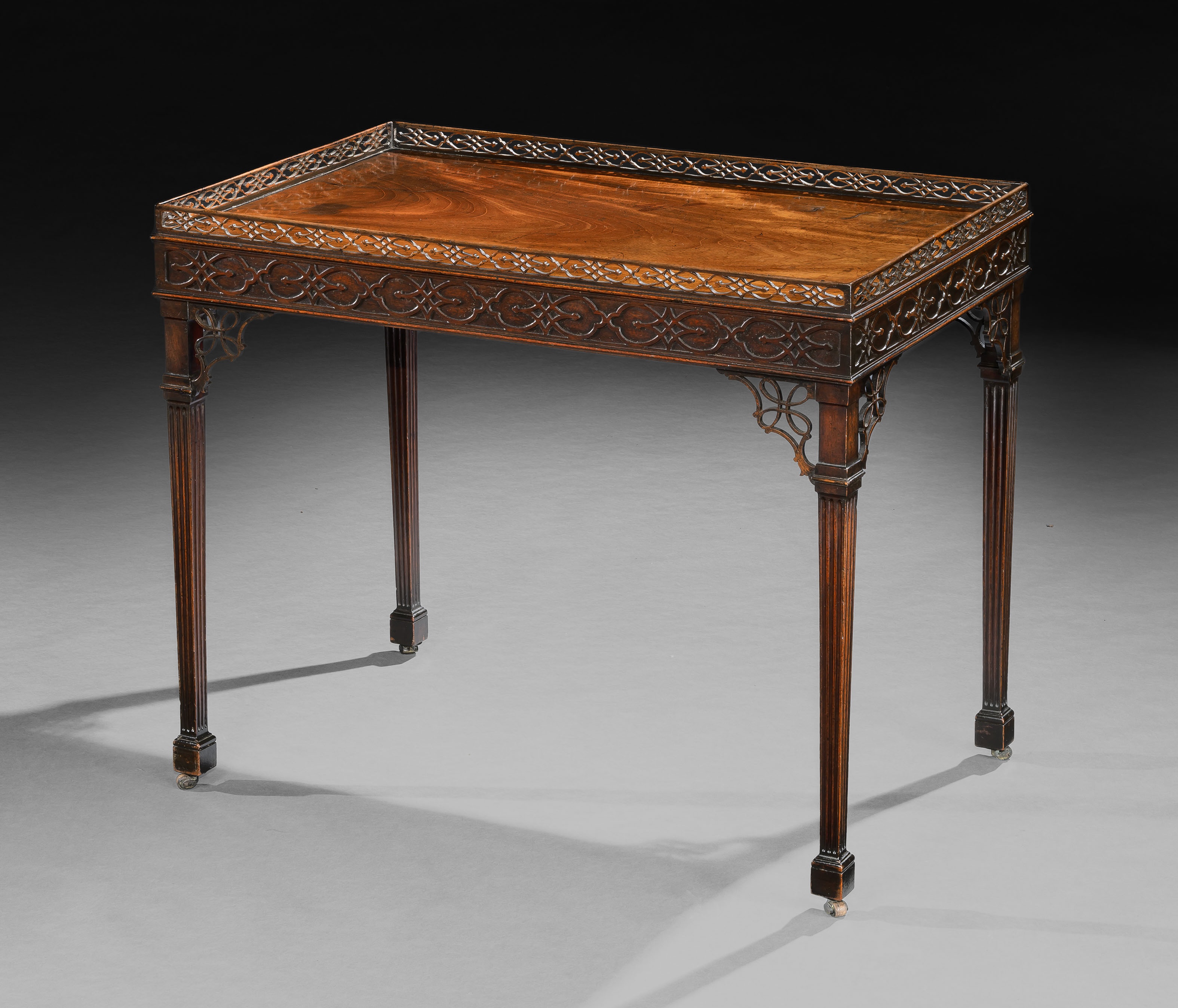 A GEORGE III MAHOGANY FRETWORK SILVER TABLE